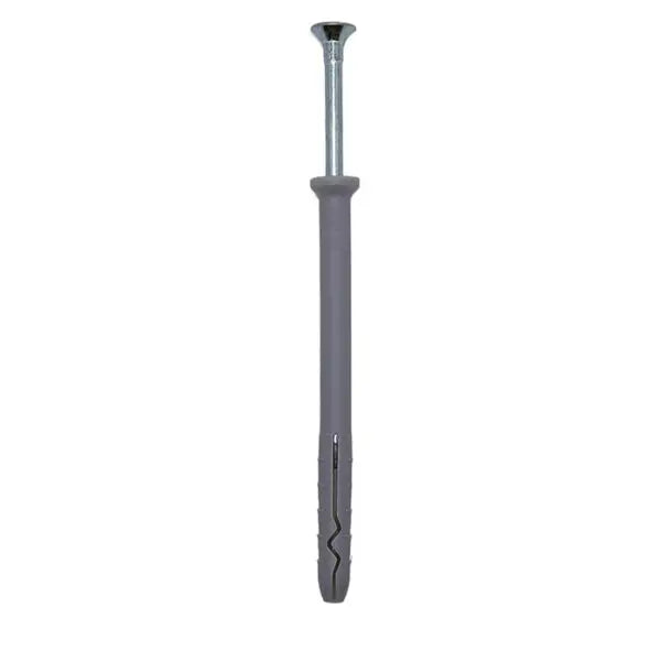 Cutie cu 50 buc – Diblu Cui Percutie 10x120mm, ce poate fi folosit pentru fixarea diferitelor accesorii in beton, zidarie, caramida plisa sau placaj. Diblu 10mm se foloseste impreuna cu holsurubul prin lovire de 5.9mm cu care vine preambalat. Diblul 10×120 ofera o suprafata mare de contact, oferind o fixare sigura si stabila a structurilor ce trebuiesc fixate.