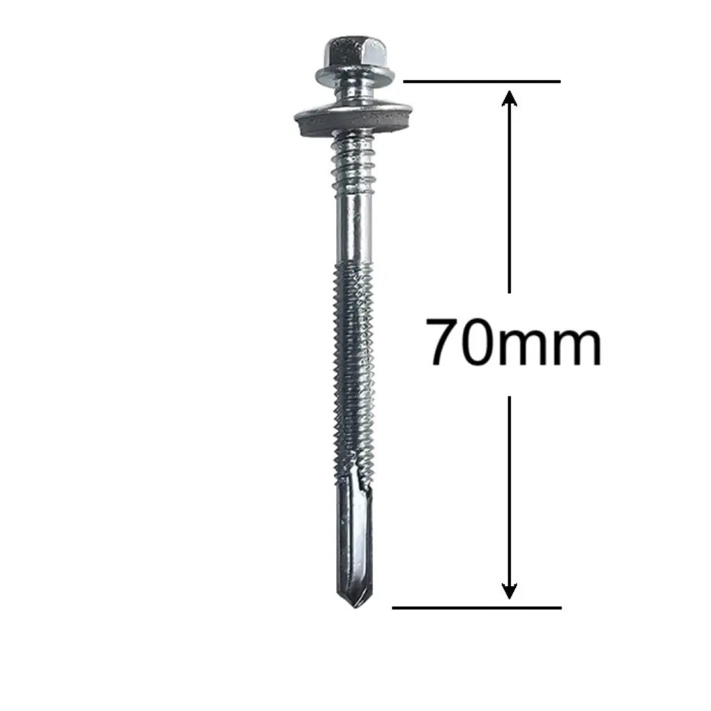 Cutie cu 50 buc – Surub Panou Sandwich 70mm Zincat prevazut cu saiba EPDM si diametrul de 5.5/6.3mm, confectionat din otel carbon electrogalvanizat cu garnitura EPDM din cauciuc si saiba din otel., cu antrenare hexgon de 8mm, ce sunt utilizate in general pentru fixarea panourilor sandwich pe structuri metalice. Aceste suruburi au o capacitate mare de perforare, de 15mm. Surubul autoforant ofera o suprafata mare de contact, oferind o fixare sigura si stabila a panourilor sandwich.