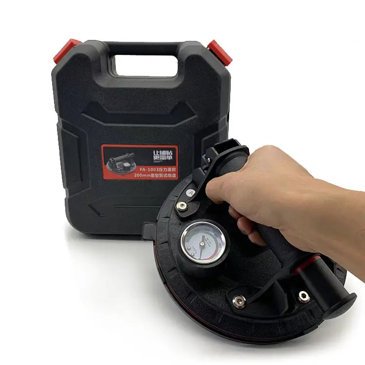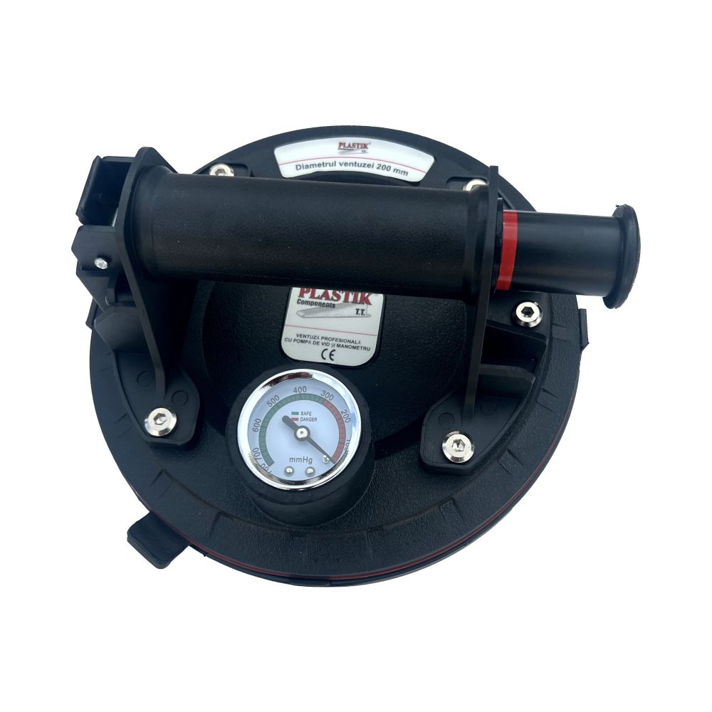 entuza profesionala cu pompa de vid si manometru pentru ridicare materiale grele – dispozitiv ventuza profesionala, cu pompa de vid si manometru, folosit pentru manipularea placilor ceramice, geamurilor, parbrizelor etc. Produsul are corpul din ABS si o ventuza din cauciuc de inalta calitate, care adera la suprafete. Capacitatea maxima de prindere este de 130 kg. in plan orizontal. Diametrul ventuzei este de 200 mm iar inaltimea dispozitivului este de 90 mm.